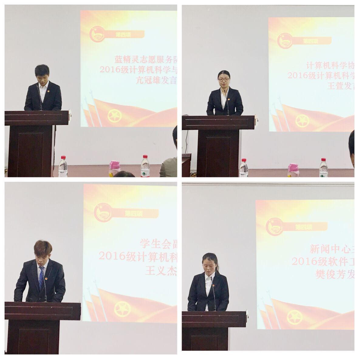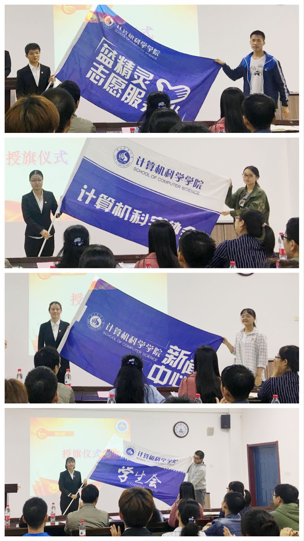 学生组织干部任职决定》。李文亮、刘佳华、刘童心、唐盼分别为学生会、色情电影、为计科协和蓝精灵授旗。为增强各组织成员之间的集体感、凝聚力,会上还组织进行了交流活动。学生会副主席王义杰、色情电影主任樊俊芳、计算机科学协会主席王萱、蓝精灵志愿服务队队长亢冠雄依次进行了发言,总结了上一年中所在部门的工作任务,并对未来的工作进行了展望、定下了目标。