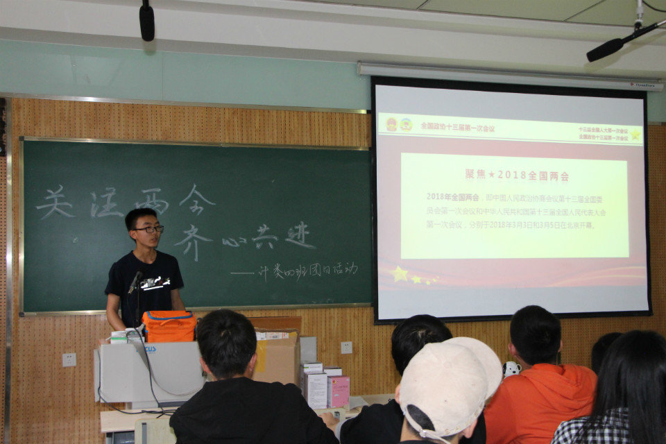 本次活动共分为三个部分。首先进行抽签分组活动以便于问答环节的展开,该环节利用电脑进行随机抽取将46个同学分配到五个不同的小组,不仅营造了比赛的氛围,而且更好的促进了同学之间的关系。其次由团支书进行PPT的讲解和部分两会视频的播放,同学们从中了解了两会的重点,懂得了2018年中国十大热点问题:扶贫、就业、医疗、教育、环保、养老、住房、消费等。接着就是激烈的问答环节,五个组实行抢答制度,大家为了争夺奖品——台灯,纷纷为自己所在的小组贡献力量,各个小组都势均力敌不分上下,但是到最后关头第一小组拿下第一获得了小台灯。最后,大家一起站在讲台上的合影为开学以来第一次团日活动划上了圆满的句号。
