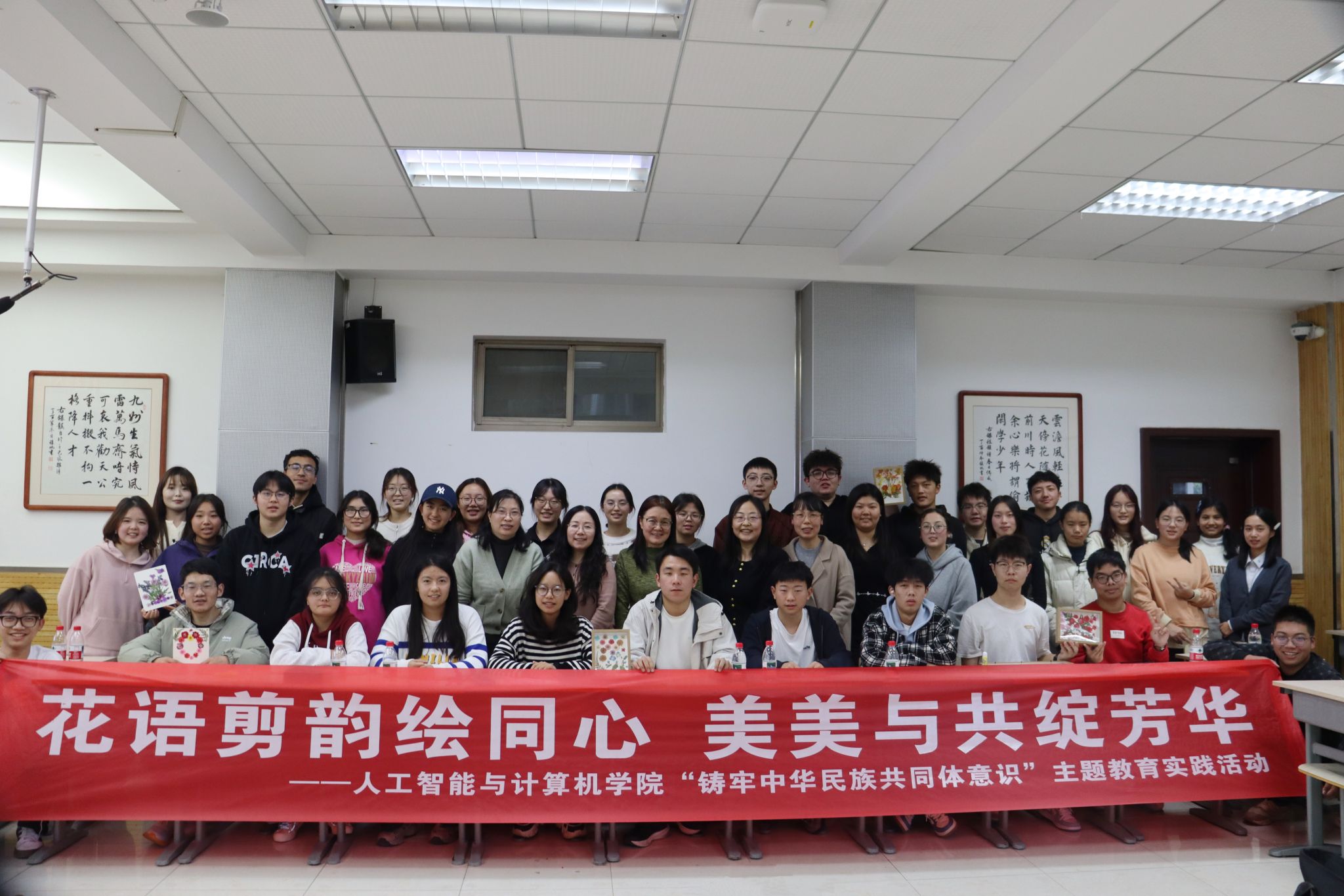 创作结束后,同学们踊跃分享,把心得感悟化作文字、融入作品,在场教师向各民族同学送上了美好祝愿。随后,《爱我中华》的悠扬旋律缓缓响起,师生们手持作品、并肩合影。镜头定格下一张张灿烂笑脸,将这份温暖人心的深厚情谊永久留存,让铸牢中华民族共同体意识的种子在欢声笑语中深深扎根。